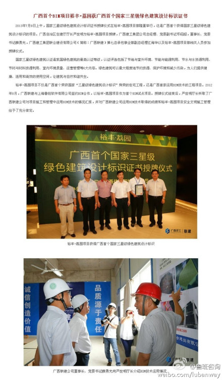 @魯班咨詢:裕豐·荔園項目不僅是廣西首個榮獲國家“h星級綠色建筑設計標識”殊榮的住宅工程,還是廣西首家運用BIM技術的工程項目。2012年8月,廣西聯(lián)建與上海魯班軟件有限公司簽約BIM合作,以裕豐?荔園項目作為首個BIM試點項目 。