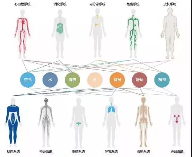 從空氣和營養(yǎng)等策略上支持減少對消化系統(tǒng)有負面影響的因素;從營養(yǎng)、舒適策略上幫助減少外界對內(nèi)分泌系統(tǒng)的干擾;從水和空氣策略總結了可幫助增強免疫系統(tǒng)健康的元素;從水和空氣策略幫助維護皮膚系統(tǒng)的整體健康;從舒適、健身、營養(yǎng)策略鼓勵安全健身和更加健康飲食的機會。