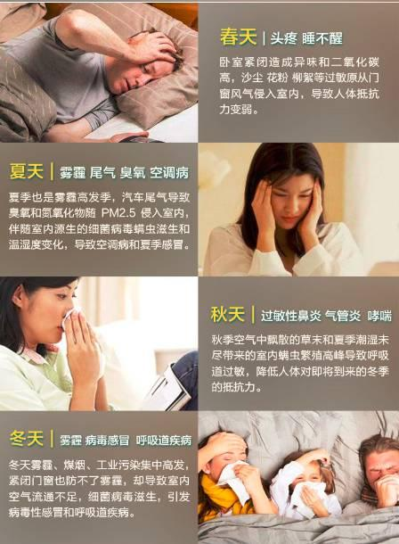 除了霧霾已經(jīng)從冬季變成四季常態(tài),春夏秋冬還各有各的空氣問題,春天頻發(fā)的沙塵暴、柳絮、臭氧超標、花粉過敏,夏季久閉門窗開啟空調(diào)導致的霉菌滋生和空調(diào)病,秋季空氣中充滿的草粉艾末會導致嚴重的過敏性鼻炎和呼吸道疾病,冬天除了霧霾,汽車尾氣和工業(yè)污染導致的硫化物、氮氧化物等氣體污染物更具危害。