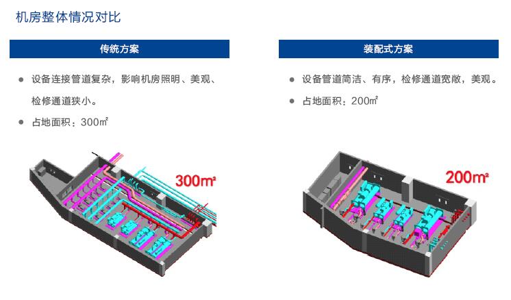 安裝便捷傳統(tǒng)機(jī)房的安裝方式是將大量原材料堆積起來(lái),采用割槍、電焊機(jī)等進(jìn)行現(xiàn)場(chǎng)的安裝作業(yè)。在這種模式下,安裝人員一般選擇現(xiàn)場(chǎng)焊接和架空安裝,不僅容易造成管道內(nèi)焊渣進(jìn)入水泵、主機(jī)等重要設(shè)備,造成設(shè)備運(yùn)行故障;而且所采用大型槽鋼支架受力會(huì)直接減少有效通道面積,存在一定的安全隱患。這種安裝模式不僅難度大,而且現(xiàn)場(chǎng)堆積的大量原材料會(huì)造成施工現(xiàn)場(chǎng)通行、管理不便,人員配置多卻效率低,施工工期長(zhǎng),一般需要2到3個(gè)月的安裝時(shí)間,不符合當(dāng)下對(duì)環(huán)保、安全、高效的機(jī)房建造要求。由于傳統(tǒng)模式下機(jī)房的質(zhì)量與美觀很大程度上依賴于施工人員的經(jīng)驗(yàn),直接導(dǎo)致施工結(jié)果的參差不齊,阻礙了機(jī)房行業(yè)的標(biāo)準(zhǔn)化進(jìn)程。和傳統(tǒng)機(jī)房相比,裝配式低能耗機(jī)房是在工廠精密設(shè)備加工后,將功能模塊運(yùn)送至現(xiàn)場(chǎng)直接進(jìn)行拼裝。在這種模式下,不僅加工質(zhì)量和美觀性能夠得到保障,而且安裝難度低、直接消除了安裝中的各類安全隱患和可能出現(xiàn)的設(shè)備運(yùn)行故障問(wèn)題。這種模式下的安裝現(xiàn)場(chǎng)整潔寬敞,通行與管理方便高效,需要的人員較少,施工工期短,現(xiàn)場(chǎng)安裝時(shí)間約為半個(gè)月左右,打造標(biāo)準(zhǔn)化的環(huán)保、安全、高效的機(jī)房安裝環(huán)境與卓越成品質(zhì)量,符合當(dāng)下快節(jié)奏、高效率的機(jī)房安裝需求,是未來(lái)機(jī)房的主流安裝模式。