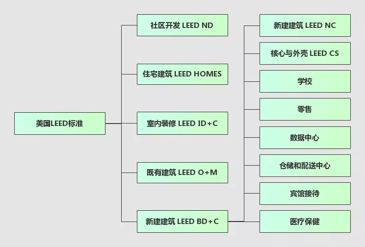 美國LEED標(biāo)準(zhǔn)分為5大類,分別為:新建建筑設(shè)計及施工(LEED BD+C)、既有建筑運營及維護(LEED O+M)、室內(nèi)裝修設(shè)計及施工(LEED ID+C)、住宅建筑(LEED HOMES)、社區(qū)開發(fā)(LEED ND)。其中LEED BD+C又可細分出新建建筑(LEED NC)、核心與外殼(LEED CS)、學(xué)校、零售、數(shù)據(jù)中心等等。