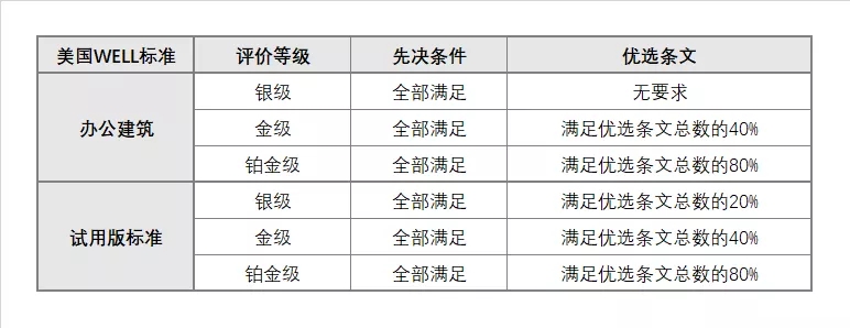 美國WELL建筑標(biāo)準(zhǔn)評價等級的劃分與前兩者不同,是通過判斷滿足的條款數(shù)量來劃分等級,分為:銀級、金級、鉑金級。