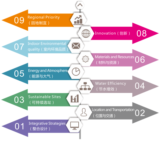 宗旨:LEED評級系統(tǒng)旨在優(yōu)化利用自然資源,促進資源再生和恢復,最大限度的發(fā)揮現(xiàn)代建造工業(yè)給人類和環(huán)境帶來的各種積極因素,盡量減少消極影響,為居住者提供優(yōu)質(zhì)舒適的生活環(huán)境。
