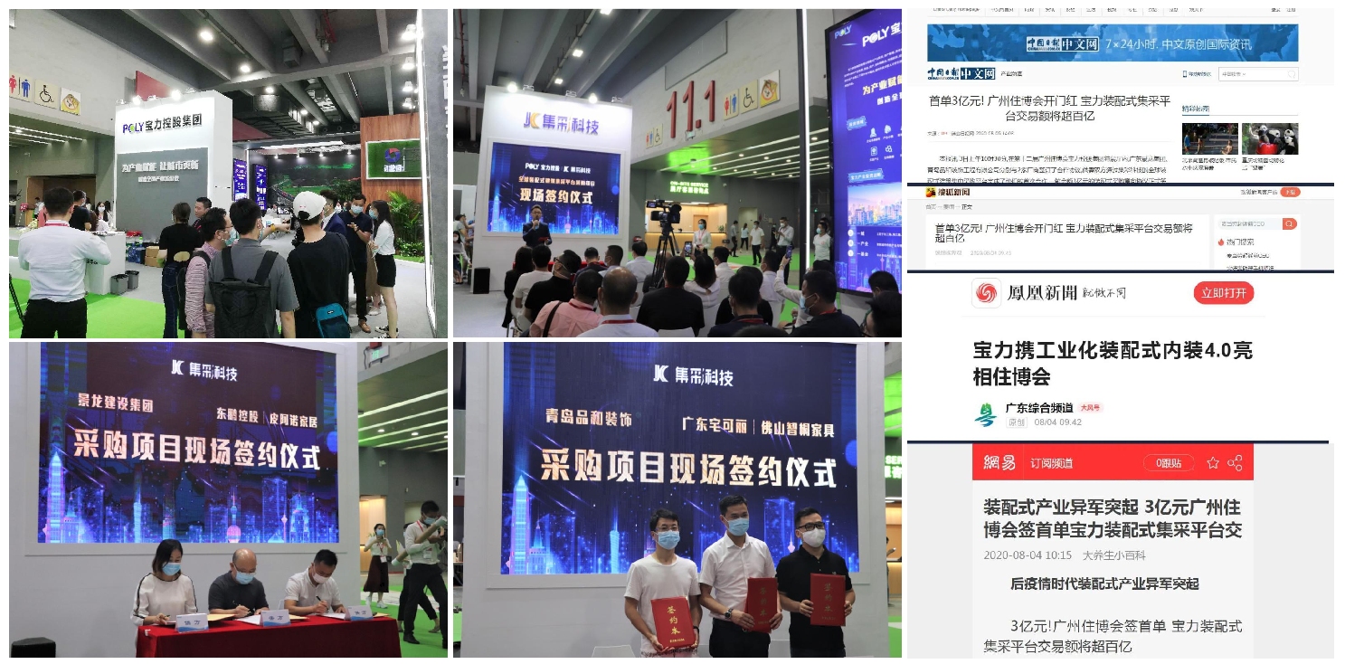 2、展會(huì)開幕不到兩個(gè)小時(shí),在寶力控股集團(tuán)展廳內(nèi),廣東景龍集團(tuán)、青島品和裝飾工程有限公司分別與兩家廠商正式簽訂了裝配式采購意向協(xié)議,供需雙方通過集彩科技的全球裝配式建筑集中采購平臺完成了他們的采購合作,成為本屆住博會(huì)首單合作意向,成交金額達(dá) 3 億元!