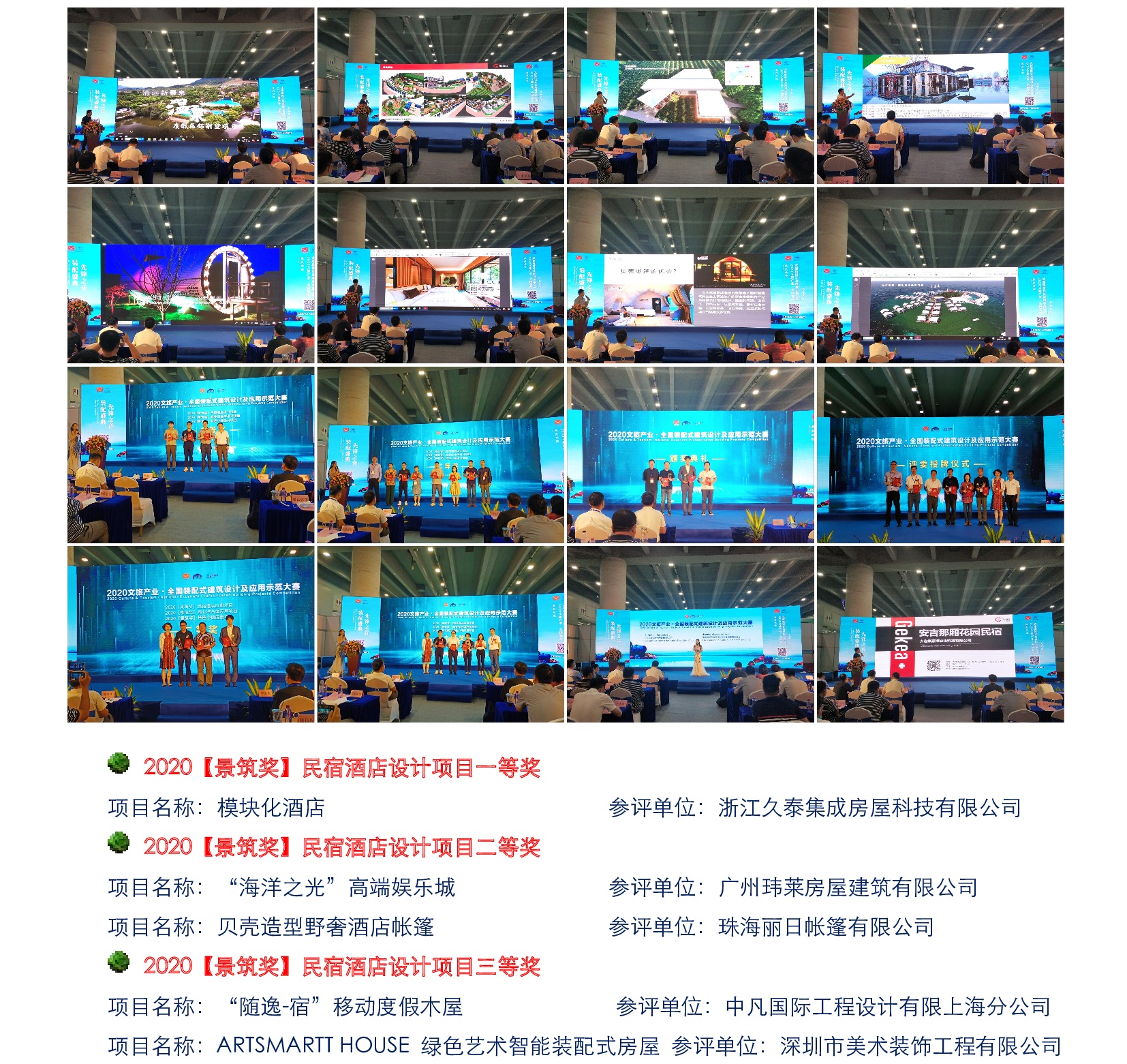 ※ 2020 文旅產(chǎn)業(yè)·全國裝配式建筑設(shè)計(jì)及應(yīng)用示范大賽為了推動(dòng)裝配式建筑在文旅產(chǎn)業(yè)的應(yīng)用,大賽組委會(huì)面向全國輕鋼結(jié)構(gòu)、鋁合金結(jié)構(gòu)、帳篷、木結(jié)構(gòu)、木塑集成、預(yù)制混凝土等不同結(jié)構(gòu)類型的低層裝配式建筑生產(chǎn)企業(yè),征集相關(guān)項(xiàng)目(含設(shè)計(jì)及竣工)實(shí)例合計(jì) 70 個(gè),并邀請來自文旅項(xiàng)目方和裝配式建筑專家共同出任評委組專家。經(jīng)過四個(gè)月的作品征集、專家初評、線上投票環(huán)節(jié),8 月 4 日上午迎來了緊張精彩的現(xiàn)場終評,最后產(chǎn)生了【民宿酒店設(shè)計(jì)獎(jiǎng)】、【民宿酒店應(yīng)用示范獎(jiǎng)】、【商業(yè)綜合體設(shè)計(jì)獎(jiǎng)】、【商業(yè)綜合體應(yīng)用示范獎(jiǎng)】、【特色小鎮(zhèn)設(shè)計(jì)獎(jiǎng)】、【特色小鎮(zhèn)應(yīng)用示范獎(jiǎng)】六大類別獎(jiǎng)項(xiàng)。來自全國各地 100 多名建筑行業(yè)專家、企業(yè)家、工程師、文旅開發(fā)商、規(guī)劃設(shè)計(jì)師出席了會(huì)議,大家一致認(rèn)為該活動(dòng)對增進(jìn)文旅與建筑領(lǐng)域的雙向合作和資源整合,促進(jìn)裝配式建筑領(lǐng)域信息化發(fā)展具有重要作用。