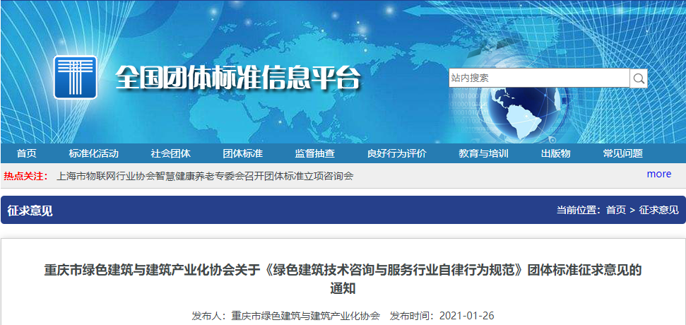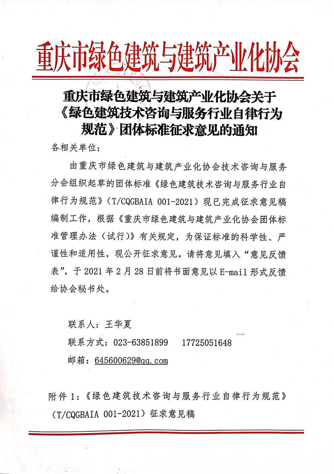 重慶市綠色建筑與建筑產(chǎn)業(yè)化協(xié)會關(guān)于《綠色建筑技術(shù)咨詢與服務(wù)行業(yè)自律行為規(guī)范》團(tuán)體標(biāo)準(zhǔn)征求意見的通知