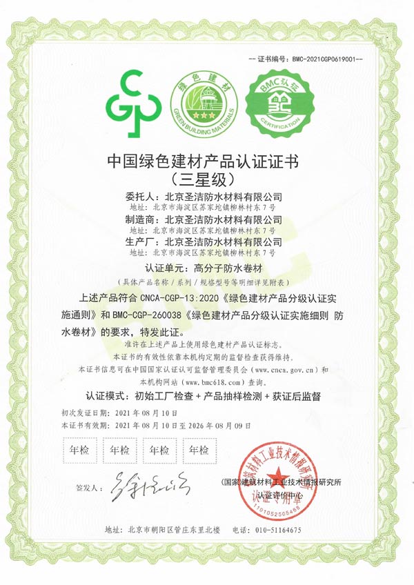 2021年8月10日,北京圣潔防水材料有限公司生產(chǎn)的高分子增強(qiáng)復(fù)合防水卷材(聚乙烯丙綸復(fù)合防水卷材)獲得了由國家建筑材料工業(yè)技術(shù)情報研究所頒發(fā)的綠色建材最高級別證書——三星級中國綠色建材產(chǎn)品認(rèn)證證書。