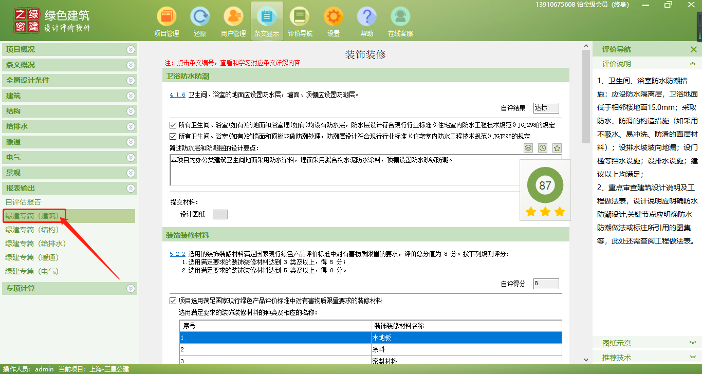 6、實(shí)時(shí)定位修改相關(guān)條文內(nèi)容;一鍵生成自評(píng)估報(bào)告、綠建專篇、審查備案表(可直接用于評(píng)審資料);;