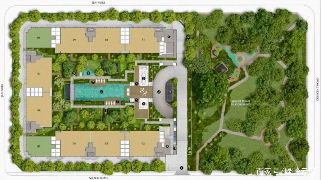項(xiàng)目位于新加坡邁耶路,毗鄰一個(gè)寧?kù)o的公園。