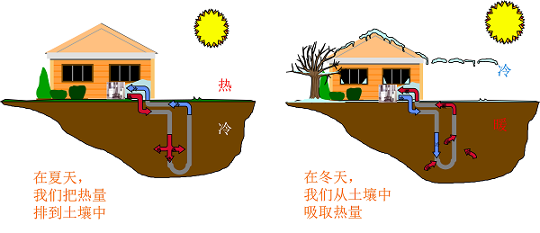 原理:以巖土體為冷熱源,由水源熱泵機組、地埋管換熱系統(tǒng)、建筑物內系統(tǒng)組成的供熱空調系統(tǒng)。