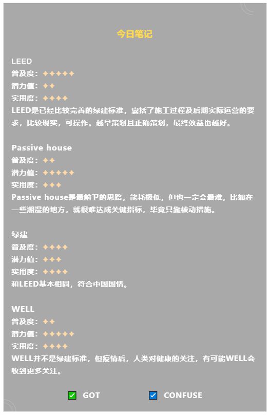 面對這些“綠色建筑”評價標準,是不是有點傻傻分不清楚?沒事兒!咱也別研究干貨了,今兒個重點都幫你整理好了,敲!黑!板!