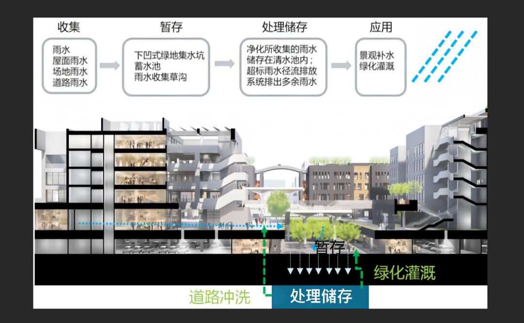 項(xiàng)目在場(chǎng)地利用、能耗、節(jié)水、選材等各方面堅(jiān)持可持續(xù)設(shè)計(jì),“以人為本” 打造健康建筑,科技創(chuàng)新 “建證”綠色篇章,通過雨水收集系統(tǒng)、雨水調(diào)蓄系統(tǒng)、雨水收集回用系統(tǒng),踐行海綿城市的生態(tài)設(shè)計(jì)理念。