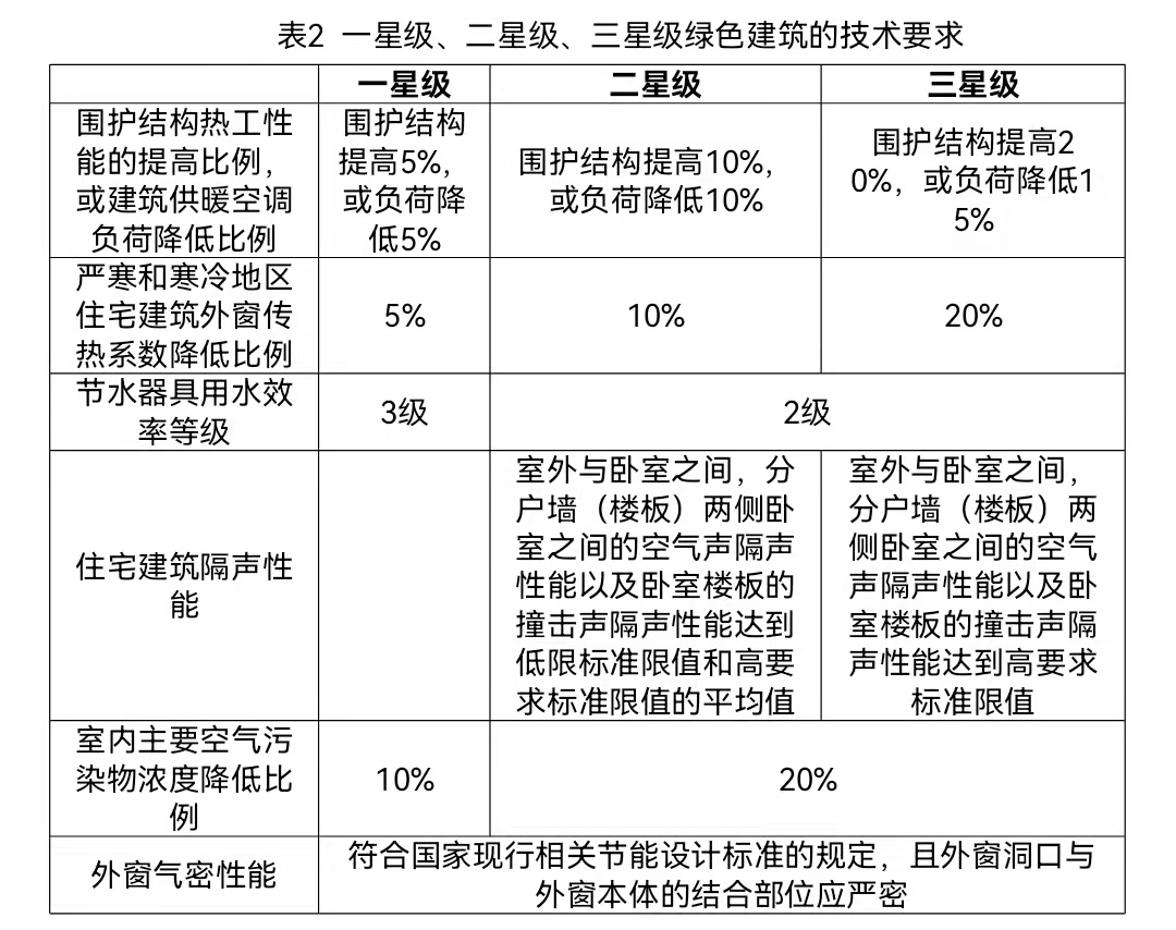 (1)增加綠色建筑基本級:新標準在原三個星級基礎上,新增“基本級”,即基本級、一星級、二星級、三星級4個等級;新版標準確定了每類指標的具體評價標準。它將評價標準分為控制項、評分項與加分項(僅限提高與創(chuàng)新)三類評價一個建筑是否為綠色建筑的必備條件,為該建筑應全部滿足標準中有關住宅建筑或公共建筑中控制項的要求,在滿足控制項要求后,再按評分項和加分項對建筑進行評分,根據(jù)得分以及對技術要求的滿足程度將綠色建筑劃分為四個等級(基本級、一星級、二星級、三星級)按下表確定:
