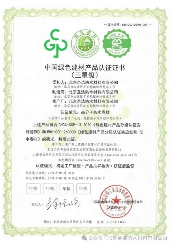 圣潔防水生產(chǎn)的聚乙烯丙綸防水卷材從1999年建廠初始就一直走綠色發(fā)展的道路,得到了國家權(quán)威部門的認(rèn)可,如:
