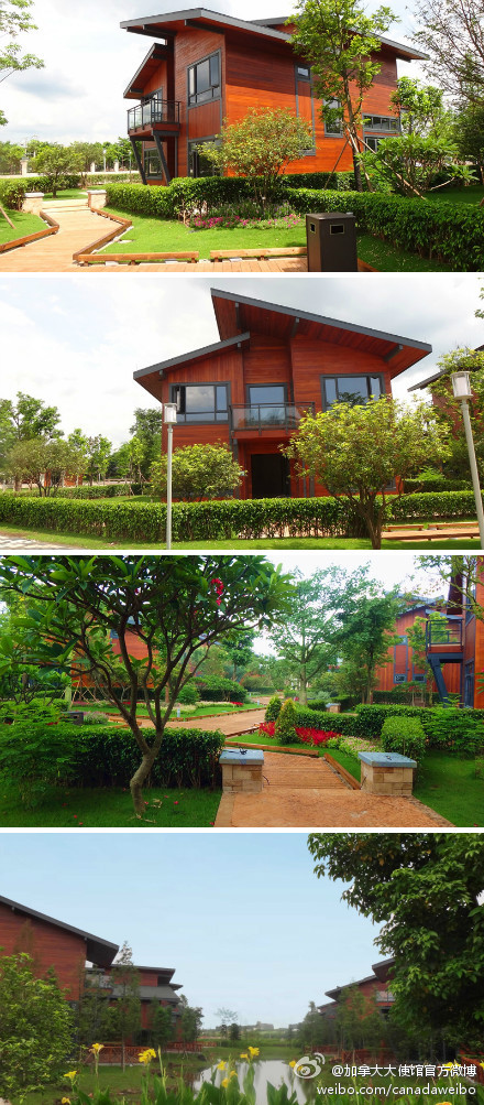 @加拿大大使館官方微博: 加拿大圖騰建筑集團(tuán)與富力合作的??诩t樹林33棟木屋別墅上周全部竣工開售。全木建造的別墅由加拿大設(shè)計(jì)師針對(duì)海南潮濕高溫,臺(tái)風(fēng)頻繁的氣候設(shè)計(jì),采用加拿大FSC認(rèn)證木材及木結(jié)構(gòu)建筑施工技術(shù),充分體現(xiàn)環(huán)保,低碳,生態(tài),是中國(guó)第一個(gè)獲綠色建筑LEED-HOME認(rèn)證項(xiàng)目。 是不是很令人心動(dòng)呢?