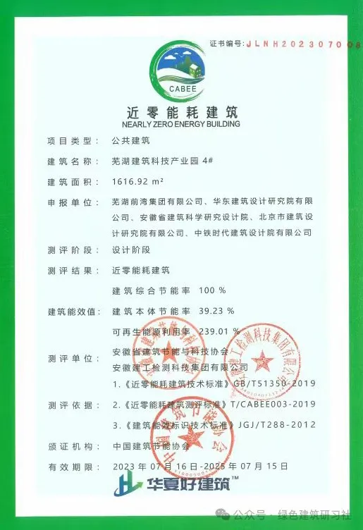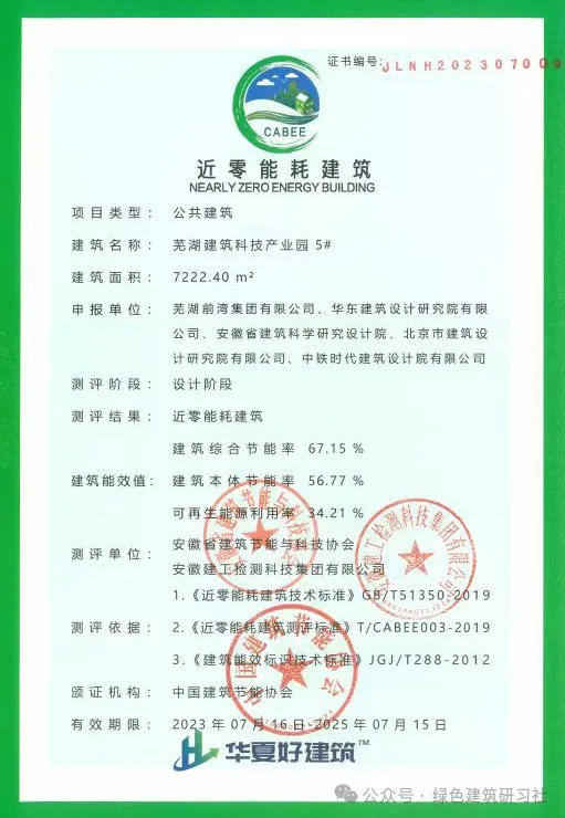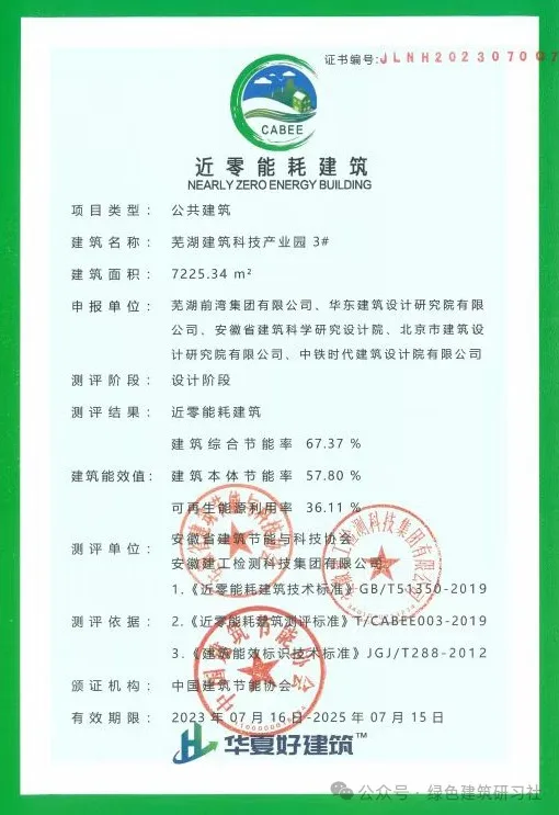 近日,安徽省蕪湖市蕪湖建筑科技產(chǎn)業(yè)園二期(A區(qū))3、4、5號(hào)樓獲得近零能耗建筑認(rèn)證。