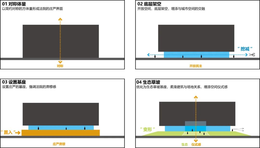 對(duì)稱(chēng)莊嚴(yán)的形態(tài)繼承了衢州傳統(tǒng)地域建筑的空間軸線關(guān)系,與衢州歷史文脈交相呼應(yīng);生態(tài)草坡基座的置入,使建筑更具莊嚴(yán)肅穆感;展現(xiàn)了司法建筑公正、公平、正義、端莊、嚴(yán)謹(jǐn)的形象特點(diǎn)。