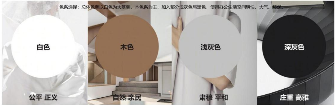 法院室內(nèi)空間設(shè)計(jì)延續(xù)建筑外部設(shè)計(jì)理念,內(nèi)部空間與外部形態(tài)相呼應(yīng)??傮w色調(diào)以白色為大基調(diào),木色系為主,加入部分淺灰色與黑色,使得辦公生活空間明快、大氣、生態(tài)、環(huán)保。體現(xiàn)公平、正義、自然、親民、肅穆、平和、莊重、典雅的設(shè)計(jì)理念。