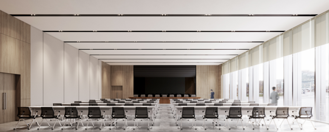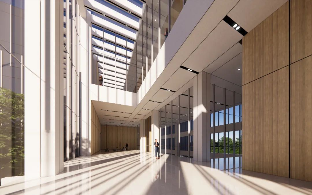 建筑南立面采用漸變式遮陽(yáng)格柵玻璃幕墻,通過(guò)重復(fù)與漸變的韻律節(jié)奏,使得整個(gè)建筑在光影的變幻中展現(xiàn)出大氣而不失細(xì)膩的質(zhì)感。