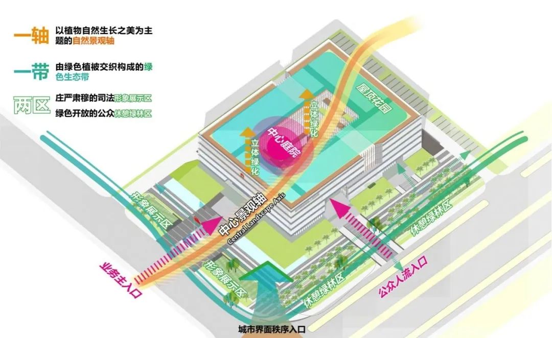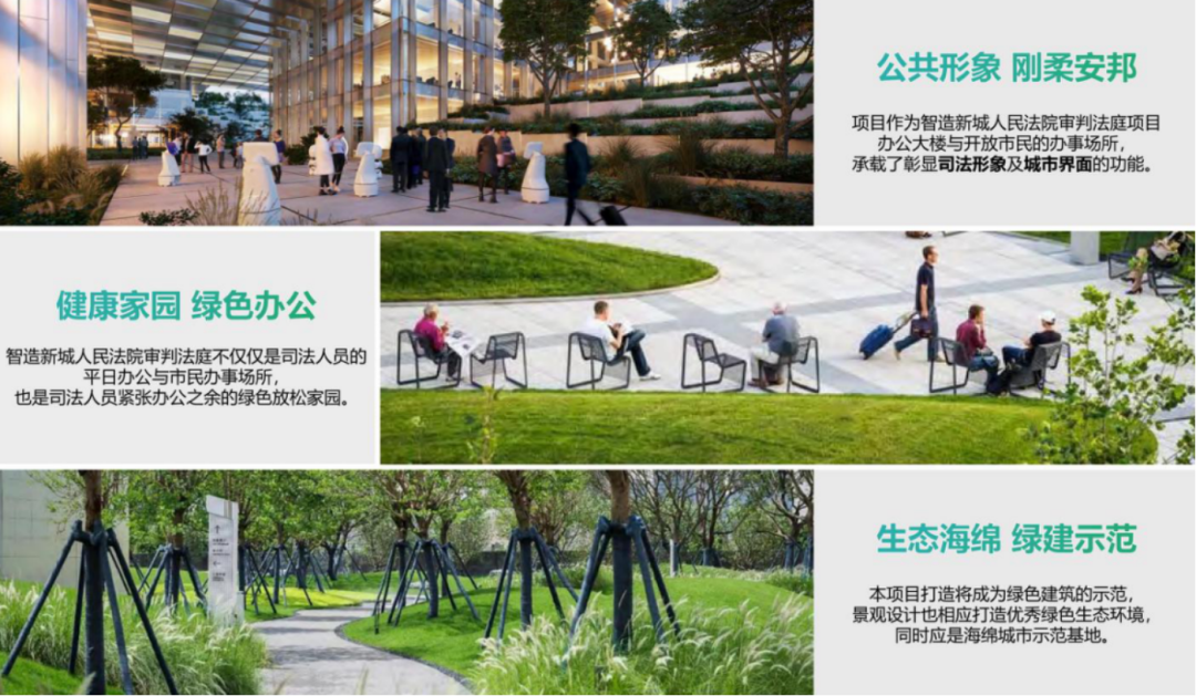 法院景觀與法院建筑相輔相成,承載彰顯司法形象及城市界面的功能,不僅僅是司法人員的辦公場(chǎng)所,也是市民法治教育與休閑綠色放松家園。