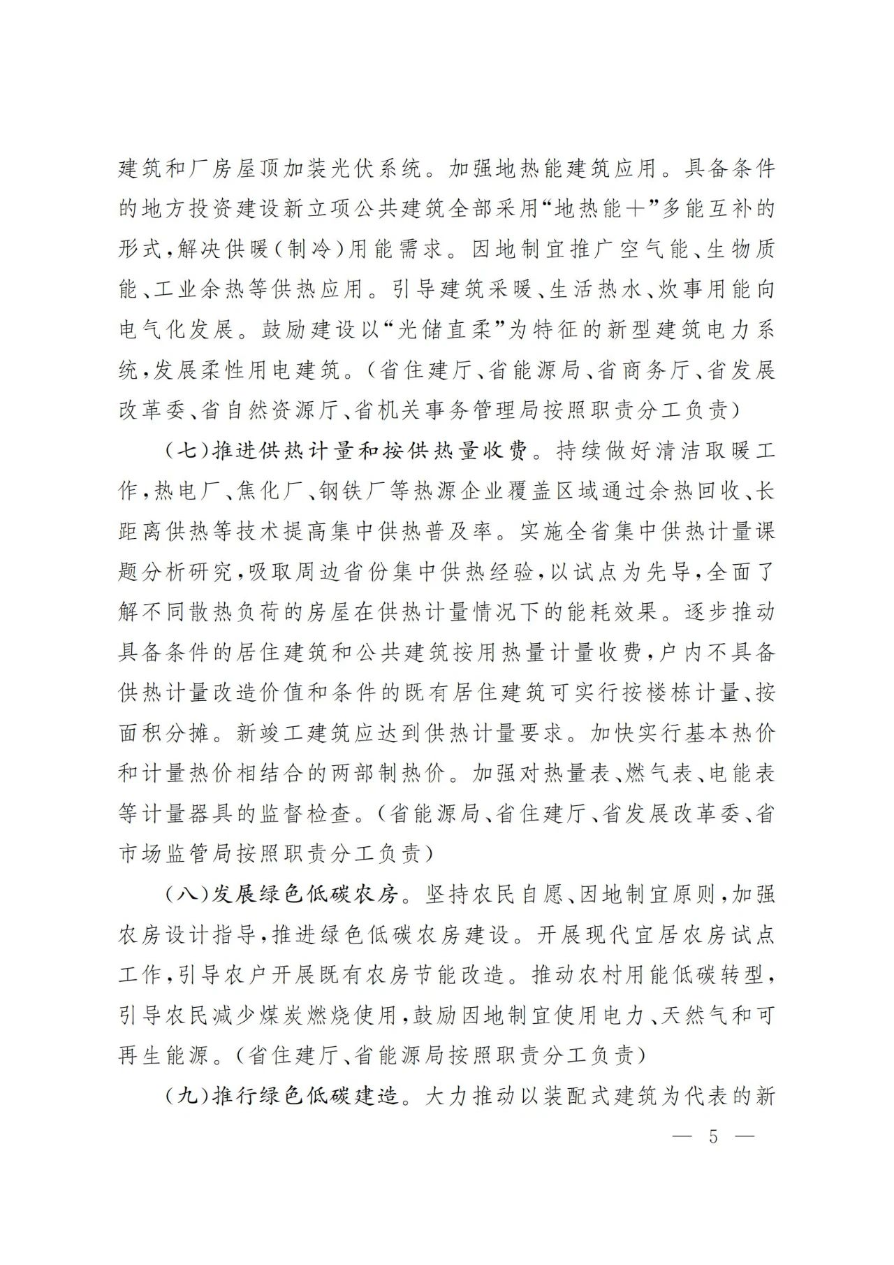 (八)發(fā)展綠色低碳農(nóng)房。堅持農(nóng)民自愿、因地制宜原則,加強農(nóng)房設(shè)計指導(dǎo),推進綠色低碳農(nóng)房建設(shè)。開展現(xiàn)代宜居農(nóng)房試點工作,引導(dǎo)農(nóng)戶開展既有農(nóng)房節(jié)能改造。推動農(nóng)村用能低碳轉(zhuǎn)型,引導(dǎo)農(nóng)民減少煤炭燃燒使用,鼓勵因地制宜使用電力、天然氣和可再生能源。(省住建廳、省能源局按照職責(zé)分工負(fù)責(zé))