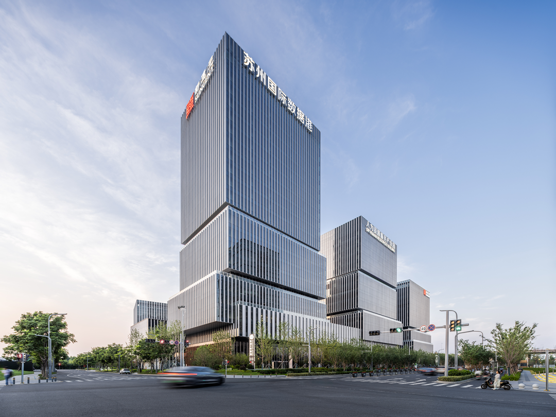 最高的塔樓為108米,將現(xiàn)代與傳統(tǒng)融合,建筑形態(tài)靈感源于蘇州留園中著名的“冠云峰”,豎向線條流暢,寓意“高山流水”,為園區(qū)注入獨(dú)特魅力和文化底蘊(yùn)。
