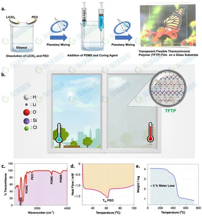 研究團隊提出了一種由聚環(huán)氧乙烷(PEO)、聚二甲基硅氧烷 (PDMS)聚合物和高氯酸鋰(LiClO4)堿性鹽組成的,具有熱致變色行為的三組分系統(tǒng)。通過利用PEO-堿性鹽復合物在溫度刺激下發(fā)生的相變和吸濕性改變,該聚合物薄膜能夠在30°C左右時由高可見光透射率狀態(tài)轉(zhuǎn)變?yōu)椴煌该鳡顟B(tài)。同時,該聚合物薄膜表現(xiàn)出了可靠的耐久性和抗光降解性。此外,利用常見的涂布手段就可以將該聚合物薄膜輕松涂覆在各種表面上。這種新型熱致變色聚合物薄膜對于建筑物節(jié)能具有重要意義。