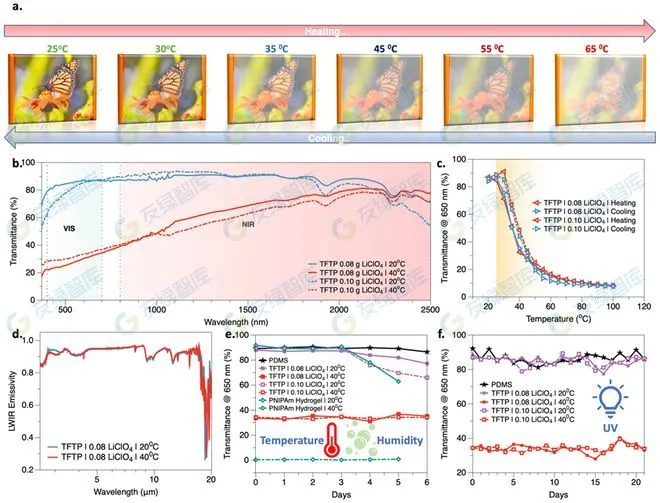 圖2A展示了不同溫度下涂在玻璃板上的TFTP薄膜的外觀變化。與通常呈現(xiàn)棕黃色色調(diào)的二氧化釩薄膜以及其他無機熱致變色材料相比,TFTP薄膜在不透明狀態(tài)時顯示出視覺上較為舒適的白色。通過可見-近紅外光譜可以觀察到:當溫度升高時,TFTP樣品表現(xiàn)出從360nm(可見光)到2500nm(近紅外)的透射率差異。該混合物的可見光透射率(Tvis)和太陽光調(diào)制能力(ΔTsol)與現(xiàn)有熱致變色水凝膠相當。