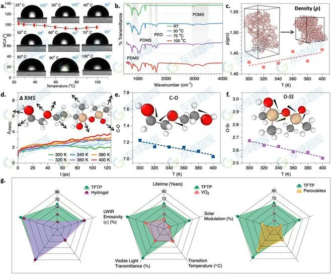 通過這些結(jié)果,研究團隊得出結(jié)論:溫度變化通過對于TFTP薄膜中內(nèi)聚力和混溶性的影響引起了TFTP膜的結(jié)構(gòu)重構(gòu)。從而導致了TFTP膜在較高溫度下發(fā)生相分離,并且使得其太陽光透射率發(fā)生改變。