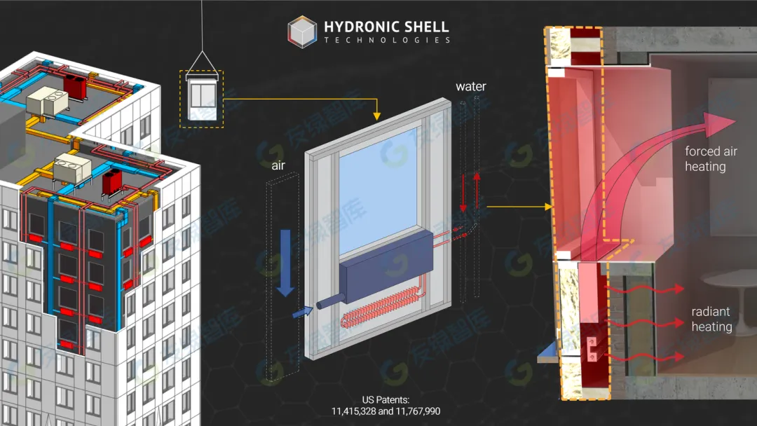 Hydronic Shell 預(yù)制立面板包括為多單元住宅建筑中的每個(gè)單元提供完整的供暖、制冷和通風(fēng)所需的所有元件,或處理其他建筑類(lèi)型(如辦公室、學(xué)校和倉(cāng)庫(kù))的周邊負(fù)載。每個(gè)面板中的管道和管道系統(tǒng)連接到垂直立管,形成一個(gè)完整的 HVAC 系統(tǒng),所有組件都封閉在新立面內(nèi)。(美國(guó)專(zhuān)利:11,415,328 和 11,767,990)