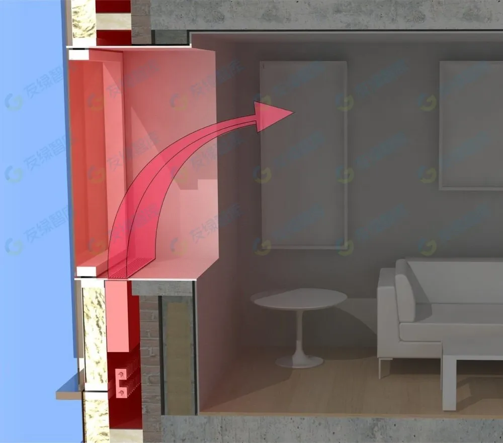 HydroBox 是風(fēng)機(jī)盤(pán)管機(jī)組和主動(dòng)冷梁的混合體。它安裝在 HVAC 腔內(nèi),窗臺(tái)上有一個(gè)格柵。它補(bǔ)充了輻射供暖和制冷的能力,并將經(jīng)過(guò)調(diào)節(jié)的通風(fēng)空氣混合到房間內(nèi)。它專(zhuān)為靜音操作而設(shè)計(jì),可通過(guò)頂部格柵輕松訪(fǎng)問(wèn)所有組件。每個(gè) HydroBox 需要的功率不到 30W,可由集成到外立面的低壓布線(xiàn)系統(tǒng)供電。