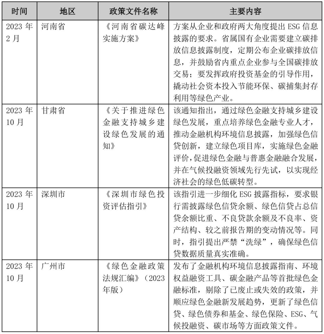 2023年,很多省市地方層面根據(jù)最新的中央政策文件的指導(dǎo)要求,對(duì)ESG相關(guān)信息披露進(jìn)行了進(jìn)一步的指導(dǎo)。2023年2月,河南省發(fā)布《河南省碳達(dá)峰實(shí)施方案》,方案從企業(yè)和政府兩大角度提出ESG信息披露的要求:省屬國(guó)有企業(yè)需要建立碳排放信息披露制度,定期公布企業(yè)碳排放信息,并鼓勵(lì)省內(nèi)重點(diǎn)企業(yè)參與全國(guó)碳排放交易;要發(fā)揮政府投資基金的引導(dǎo)作用,撬動(dòng)社會(huì)資本投入節(jié)能環(huán)保、碳捕集封存利用等綠色產(chǎn)業(yè)。2023年10月,深圳市發(fā)布的《深圳市綠色投資評(píng)估指引》進(jìn)一步細(xì)化ESG披露指標(biāo),要求銀行需披露綠色信貸余額、綠色信貸占總信貸余額比重、不良貸款余額及不良率、資產(chǎn)結(jié)構(gòu)、較之前報(bào)告期的變動(dòng)情況等。同時(shí),該指引提出嚴(yán)禁“洗綠”,確保綠色信貸數(shù)據(jù)質(zhì)量真實(shí)準(zhǔn)確。