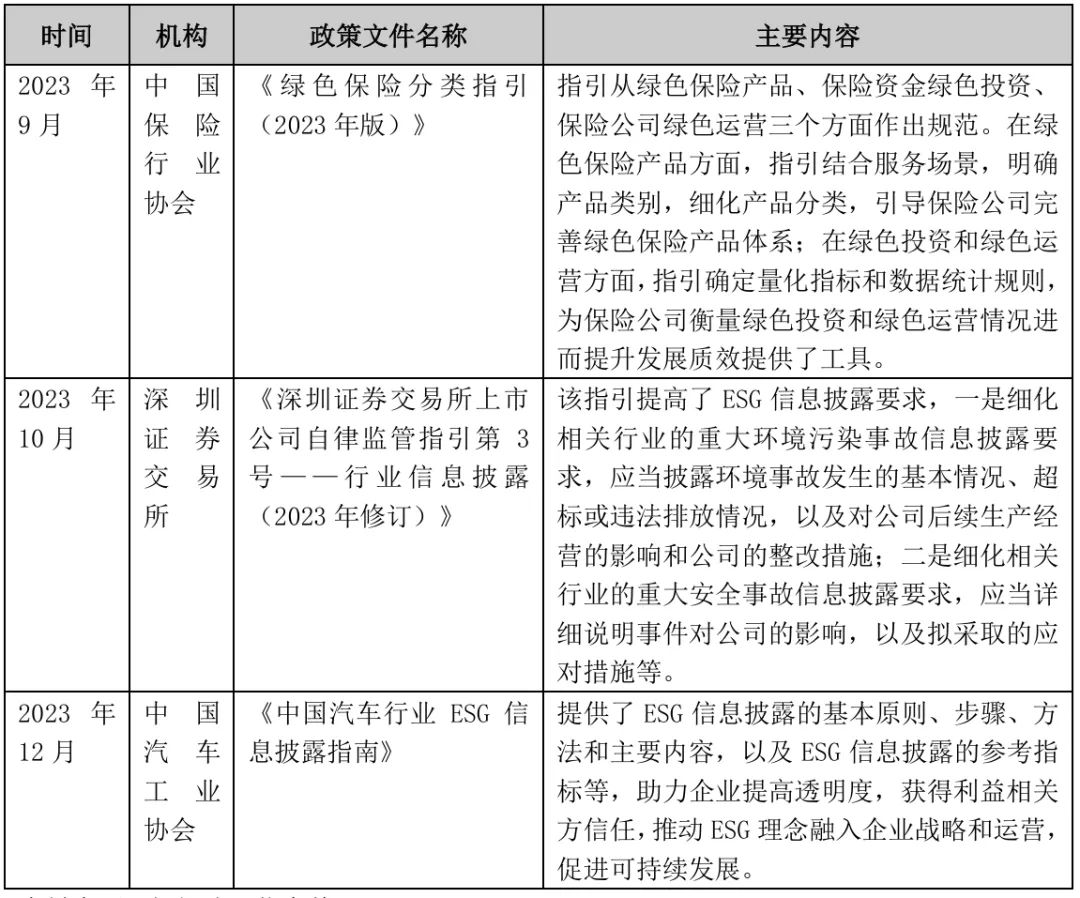 2023年10月,深交所發(fā)布的《深圳證券交易所上市公司自律監(jiān)管指引第3號(hào)——行業(yè)信息披露(2023年修訂)》提高了ESG信息披露要求,要求上市公司詳細(xì)披露重大環(huán)境污染和安全事故信息,包括事故發(fā)生的基本情況、事件對(duì)公司的影響、公司的整改措施等。同時(shí),在中國(guó)保險(xiǎn)行業(yè)協(xié)會(huì)、中國(guó)汽車工業(yè)協(xié)會(huì)等行業(yè)自律組織的推動(dòng)下,相關(guān)行業(yè)ESG信息披露標(biāo)準(zhǔn)陸續(xù)出臺(tái)。