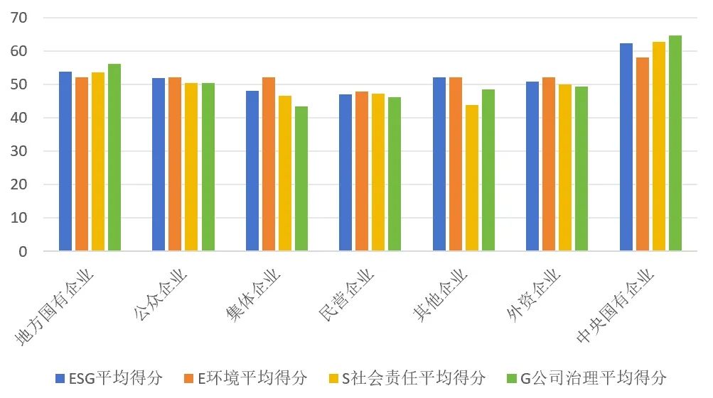 從公司屬性來看,央企ESG總分和各維度得分都領(lǐng)先于其他企業(yè),地方國(guó)有企業(yè)表現(xiàn)其次,集體企業(yè)和民營(yíng)企業(yè)表現(xiàn)落后。從環(huán)境維度來看,央企受國(guó)資委監(jiān)管要求,對(duì)“雙碳”政策的落實(shí)情況好于其他企業(yè),很多企業(yè)已經(jīng)制定了自身的碳中和目標(biāo),并且在清潔能源使用、環(huán)境管理體系建設(shè)、低碳項(xiàng)目投入等方面都有較大的投入,國(guó)有企業(yè)緊隨其后。民營(yíng)企業(yè)承擔(dān)的社會(huì)責(zé)任不如中央企業(yè),目前在環(huán)境方面還有很大的提升空間。從社會(huì)維度來看,央企和地方國(guó)企承擔(dān)較多的社會(huì)責(zé)任,包括鄉(xiāng)村振興、公益投入,而集體企業(yè)由于意識(shí)不足或能力受限等原因在社會(huì)維度得分較低。