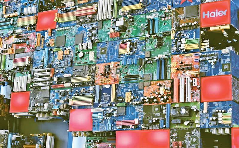 我國(guó)實(shí)施全面節(jié)約戰(zhàn)略,大力發(fā)展循環(huán)經(jīng)濟(jì)。圖為2024年9月27日,在海爾綠色再循環(huán)互聯(lián)工廠展廳內(nèi)拍攝的用廢舊電路板制作的裝飾墻。海爾綠色再循環(huán)互聯(lián)工廠每年可拆解廢舊家電200萬(wàn)臺(tái),再生循環(huán)新材料約3萬(wàn)噸。 新華社記者 李紫恒/攝