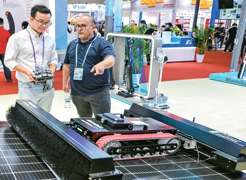 黨的十八大以來(lái),我國(guó)以年均3.3%的能源消費(fèi)增速支撐了年均6.1%的經(jīng)濟(jì)增長(zhǎng),能耗強(qiáng)度累計(jì)下降26.1%,是全球能耗強(qiáng)度降低最快的國(guó)家之一。圖為2024年10月15日,采購(gòu)商在第136屆廣交會(huì)展館了解一款太陽(yáng)能面板自動(dòng)清潔機(jī)器人產(chǎn)品。 新華社記者 劉大偉/攝