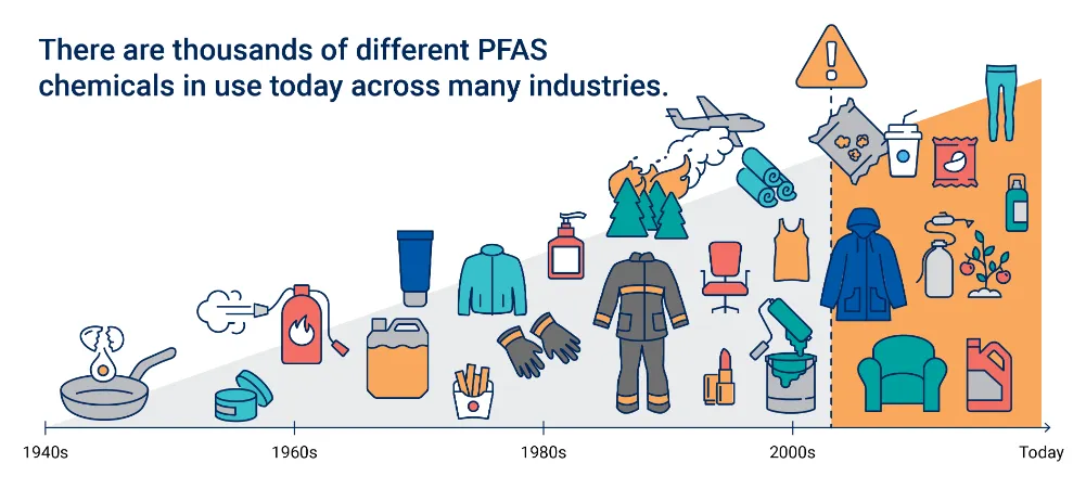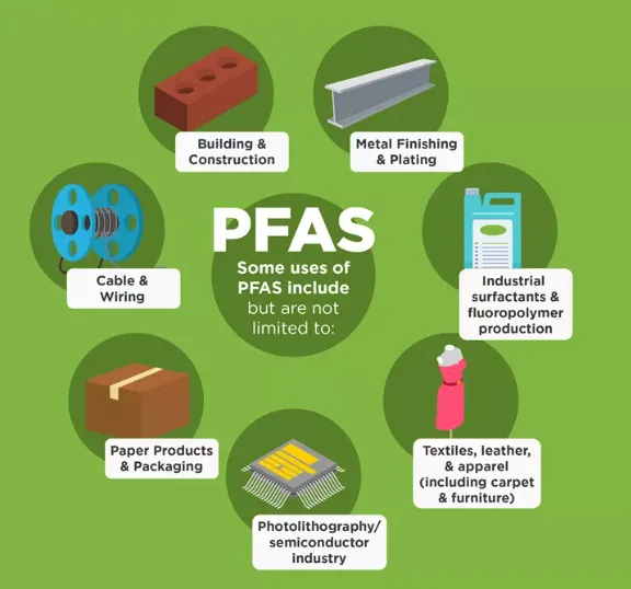 PFAS被廣泛應用于多個領域,包括:工業(yè)制造:用于半導體、涂料和防火材料;消費品:如不粘鍋、戶外裝備和防水衣物;食品包裝:用于防油紙和包裝材料;消防泡沫:在消防行業(yè)中廣泛使用。