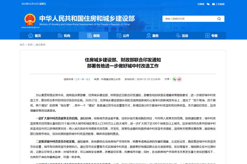 為認真貫徹落實黨中央、國務院決策部署,住建部、財政部近日聯(lián)合印發(fā)通知,部署各地加快落實增量政策措施要求,進一步做好城中村改造工作,推動符合條件的項目盡快啟動實施。10月17日,住房城鄉(xiāng)建設部部長倪虹在國務院新聞辦公室舉行的新聞發(fā)布會上,提出了“四個取消、四個降低、兩個增加”的政策“組合拳”,其中一個“增加”就是通過貨幣化安置等方式,新增實施100萬套城中村改造和危舊房改造。本次通知印發(fā)后,這項增量政策將加速落地。