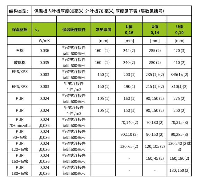 下表顯示了保溫板厚度與傳熱功能,以及不同夾心保溫板連接件對傳熱系數(shù)的影響。