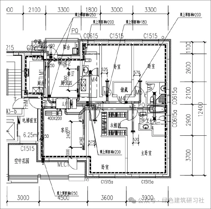 筆者以該項(xiàng)目某戶型為例進(jìn)行新風(fēng)系統(tǒng)設(shè)計(jì)的闡述,其室內(nèi)新風(fēng)系統(tǒng)布置如圖3所示。