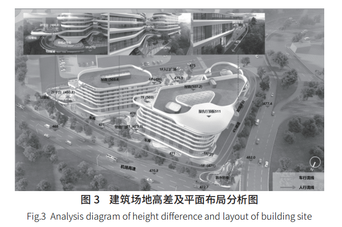 項(xiàng)目用地呈三角形,北側(cè)與機(jī)場(chǎng)西進(jìn)場(chǎng)路高差約為 5 m,南側(cè)與現(xiàn)有機(jī)場(chǎng)西貨運(yùn)區(qū)平齊。項(xiàng)目采用與所在地區(qū)氣候環(huán)境相適應(yīng)的建筑設(shè)計(jì),總平面布局利用地勢(shì)地形成了南北廣場(chǎng)的高差空間,如圖 3 所示,因地制宜地根據(jù)周邊道路高差設(shè)計(jì)雙首層辦公,充分考慮布局形式與建筑整體形式和諧統(tǒng)一。