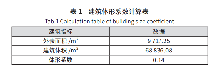 建筑體形和立面設(shè)計(jì)上,最大限度減小體形系數(shù),減小建筑外圍護(hù)面積并避免呈現(xiàn)不必要的凹凸,辦公樓建筑體形系數(shù) 0.14,小于寒冷地區(qū)體形系數(shù)規(guī)定的 s ≤ 0.40,建筑體形系數(shù)如表 1 所示。