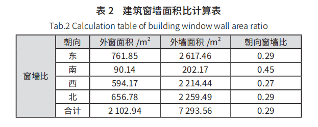 在保證建筑室內(nèi)有充足的自然采光的同時(shí)嚴(yán)格控制窗墻比,增大南向透明圍護(hù)結(jié)構(gòu)面積有利于冬季日照得熱,辦公樓東、南、西、北向窗墻比分別為 0.29、0.45、027、0.29。經(jīng)過(guò)多次負(fù)荷及能耗分析,各朝向窗墻比均不超過(guò) 0.5 時(shí),可以保證不會(huì)因建筑外窗玻璃面積過(guò)大帶來(lái)能耗的增加,建筑窗墻面積比如表 2 所示。