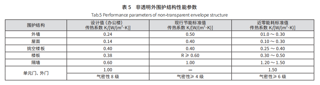 非透明圍護(hù)結(jié)構(gòu)的熱工性能是建筑性能的重要組成部分之一,該部分傳熱量約占總建筑的 40%。設(shè)計(jì)團(tuán)隊(duì)通過(guò)提高建筑圍護(hù)結(jié)構(gòu)的保溫隔熱性能,降低建筑的冷熱負(fù)荷,有效地提高建筑的氣候適應(yīng)性。同時(shí),在室內(nèi)使用高效采暖和制冷設(shè)備,從而降低建筑的運(yùn)行成本,也為使用者營(yíng)造了一個(gè)舒適高效的工作和生活環(huán)境。主要圍護(hù)結(jié)構(gòu)熱工性能均達(dá)到 GB/T 51350—2019 中寒冷氣候區(qū)近零能耗公共建筑的指標(biāo)要求,具體參數(shù)如表 5 所示。