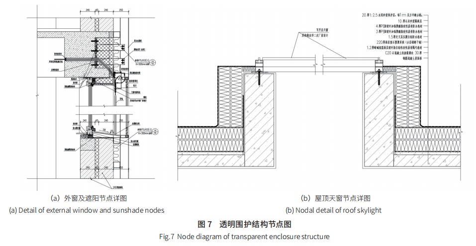 綜合考慮外窗及天窗的設(shè)計(jì),確保了在冬季綜合太陽(yáng)得熱系數(shù)不低于 0.45,而在夏季不超過(guò) 0.30。這樣的設(shè)計(jì)不僅在冬季有效利用了太陽(yáng)輻射得熱,降低了辦公區(qū)域的采暖需求,同時(shí)也通過(guò)遮陽(yáng)措施避免了夏季制冷負(fù)荷的大幅增加。被動(dòng)式外窗及天窗具體節(jié)點(diǎn)構(gòu)造如圖 7 所示。