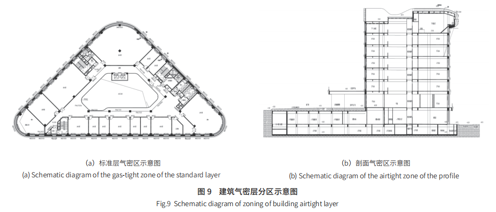 本項(xiàng)目建筑氣密性遵循 GB/T 51350—2019 關(guān)于氣密性設(shè)計(jì)施工的要求,依據(jù)建筑不同功能單元、用能情況對(duì)建筑進(jìn)行合理氣密分區(qū),進(jìn)行氣密性專項(xiàng)設(shè)計(jì);采用簡(jiǎn)潔的造型和節(jié)點(diǎn)設(shè)計(jì),減少氣密性難以處理的節(jié)點(diǎn);在建筑設(shè)計(jì)施工圖中明確標(biāo)注氣密層的位置,確保氣密層連續(xù),并包圍整個(gè)外圍護(hù)結(jié)構(gòu),如圖 9 所示。