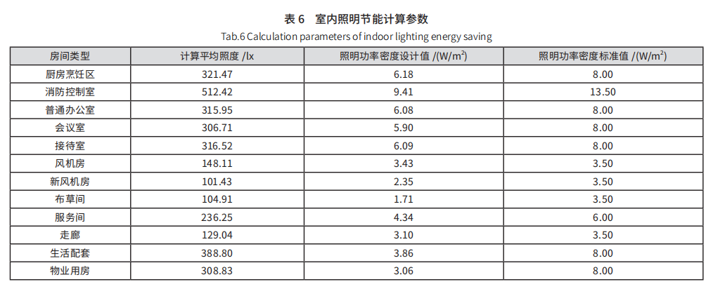 本項(xiàng)目采用智能照明系統(tǒng),所選燈具均為高效、節(jié)能型LED 燈具,采用節(jié)能控制。對(duì)設(shè)備用房采用翹板開(kāi)關(guān)分區(qū)控制,公共走廊等采用紅外延時(shí)感應(yīng)開(kāi)關(guān)控制,達(dá)到照明節(jié)能控制要求。智能照明系統(tǒng)通過(guò)回路搭配模式對(duì)所有區(qū)域照明設(shè)置為高峰模式及普通模式等,節(jié)省用電達(dá)到最佳的控制效果。主要房間照明功率密度低于現(xiàn)行照明節(jié)能標(biāo)準(zhǔn)目標(biāo)值的 70% 以下,具體如表 6 所示。