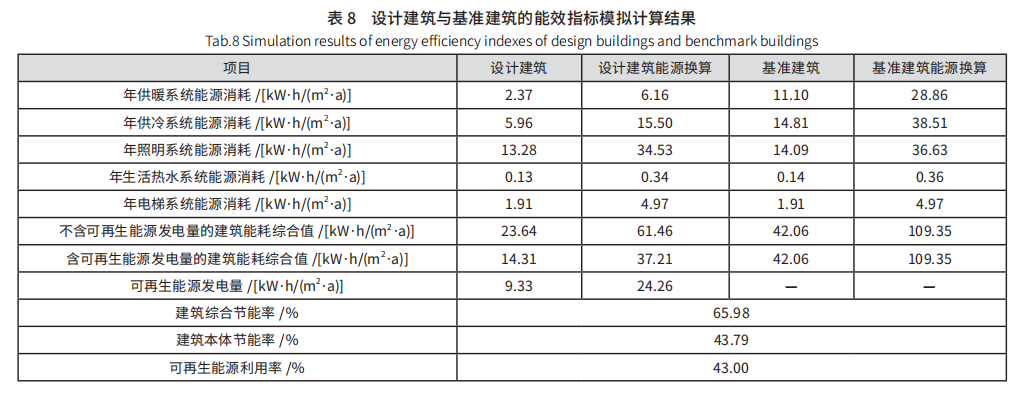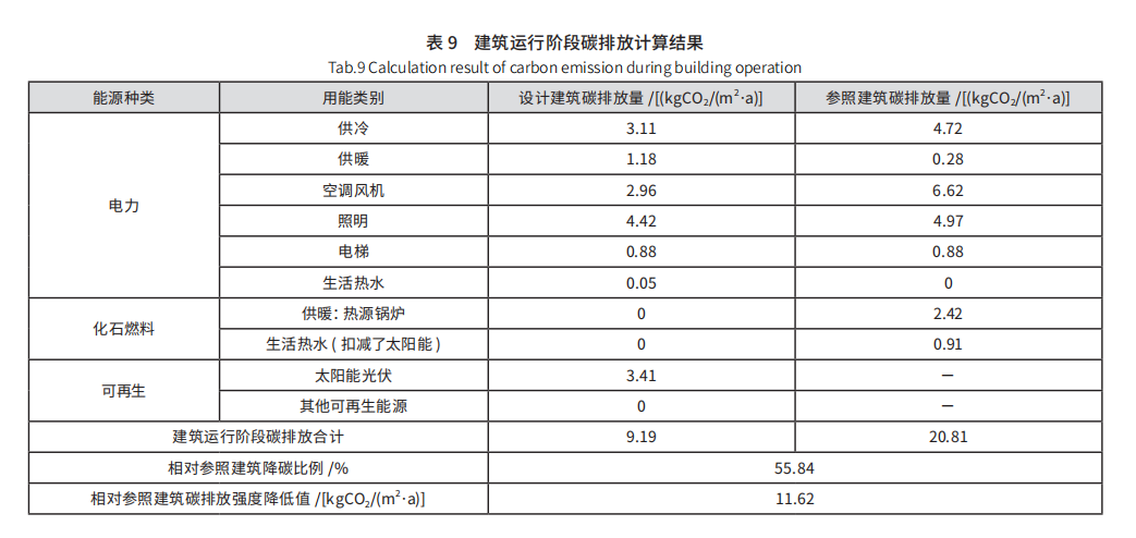 基于辦公樓的近零能耗能效模擬結(jié)果,以國(guó)家標(biāo)準(zhǔn) GB/T 51366—2019《建筑碳排放計(jì)算標(biāo)準(zhǔn)》和 GB 55015—2021《建筑節(jié)能與可再生能源利用規(guī)范》中關(guān)于建筑運(yùn)行階段碳排放計(jì)算對(duì)比為依據(jù),采用以 CAD 為平臺(tái)的碳排放 CEEB 計(jì)算并輸出建筑運(yùn)行階段碳排放指標(biāo):按電力碳排放因子 0.581 kgCO2/(kW·h),建筑年運(yùn)行碳排放強(qiáng)度為 9.19 kgCO2/(m2·a),在 2016 年執(zhí)行的公共建筑節(jié)能設(shè)計(jì)標(biāo)準(zhǔn)的基礎(chǔ)上降低 55.84%, 碳排放強(qiáng)度下降11.62 kgCO2/(m2·a),具體數(shù)據(jù)如表 9 所示。