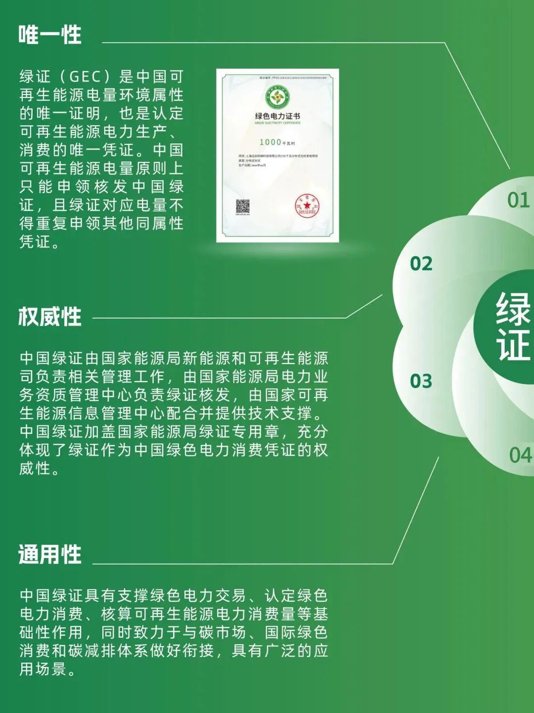 中國綠證是指可再生能源綠色電力證書,是中國可再生能源電量環(huán)境屬性的唯一證明,是認(rèn)定可再生能源電力生產(chǎn)、消費的唯一憑證。綠證作為可再生能源電力消費憑證,用于可再生能源電力消費量核算、可再生能源電力消費認(rèn)證等。1個綠證單位對應(yīng)1000千瓦時可再生能源電量。