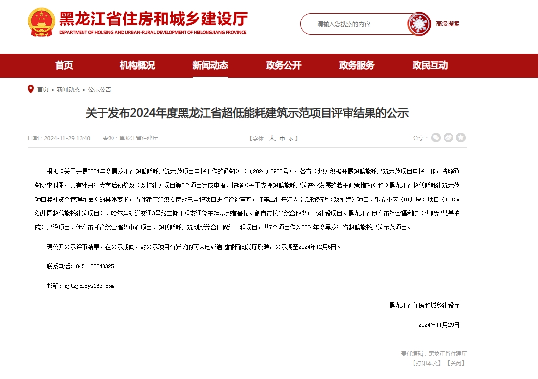 按照《關于支持超低能耗建筑產(chǎn)業(yè)發(fā)展的若干政策措施》和《黑龍江省超低能耗建筑示范項目獎補資金管理辦法》的具體要求,省住建廳組織專家對已申報項目進行評議審查,評審出牡丹江大學后勤整改(改擴建)項目、樂安小區(qū)(01地塊)項目(1-12#幼兒園超低能耗建筑項目)、哈爾濱軌道交通3號線二期工程安通街車輛基地宿舍樓、鶴崗市托育綜合服務中心建設項目、黑龍江省伊春市社會福利院(失能智慧養(yǎng)護院)建設項目、伊春市托育綜合服務中心項目、超低能耗建筑創(chuàng)新綜合體修繕工程項目,共7個項目作為2024年度黑龍江省超低能耗建筑示范項目。